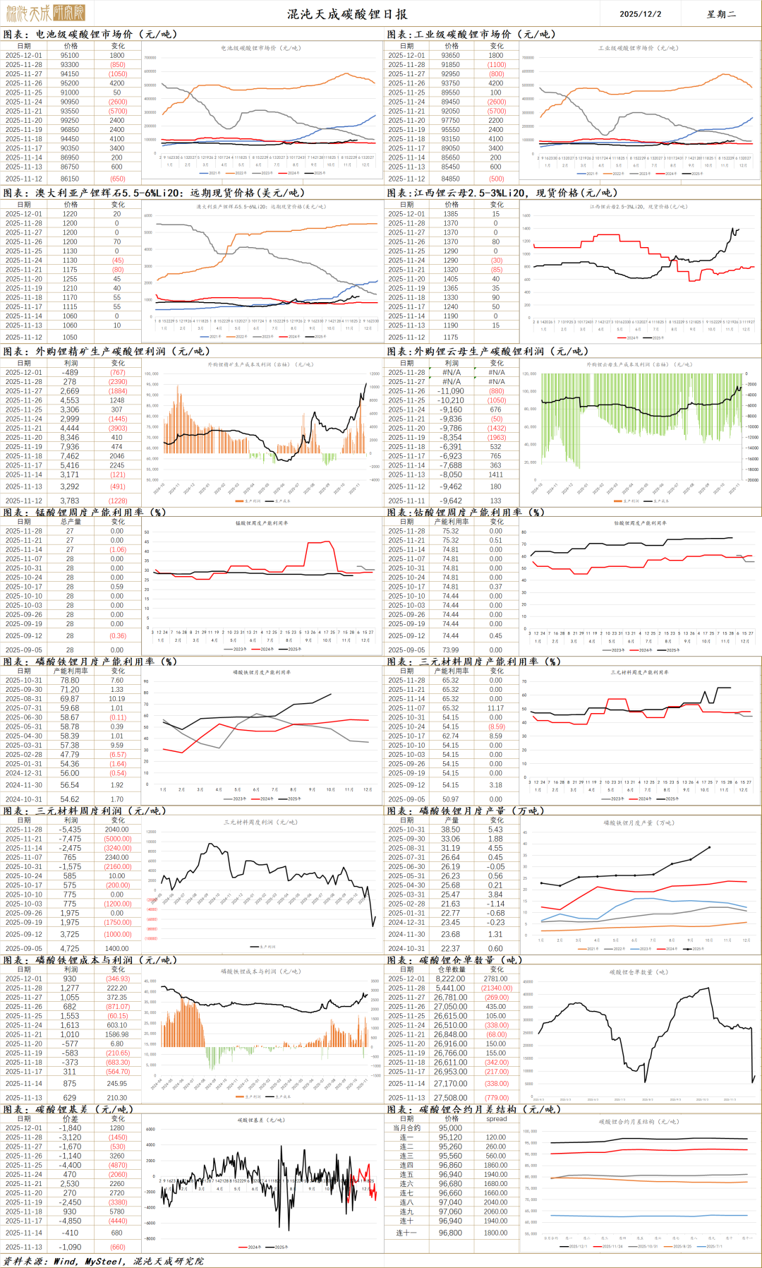 昨日碳酸锂主力合约收盘价96940元/吨,涨跌幅0.56%。主力合约持仓+26635至543633手,仓单+2781至8222吨。现货方面,电池级碳酸锂报价+1800至95100元/吨,工业级碳酸锂报价+1800至93650元/吨。锂精矿均价+5至1223美元/吨。