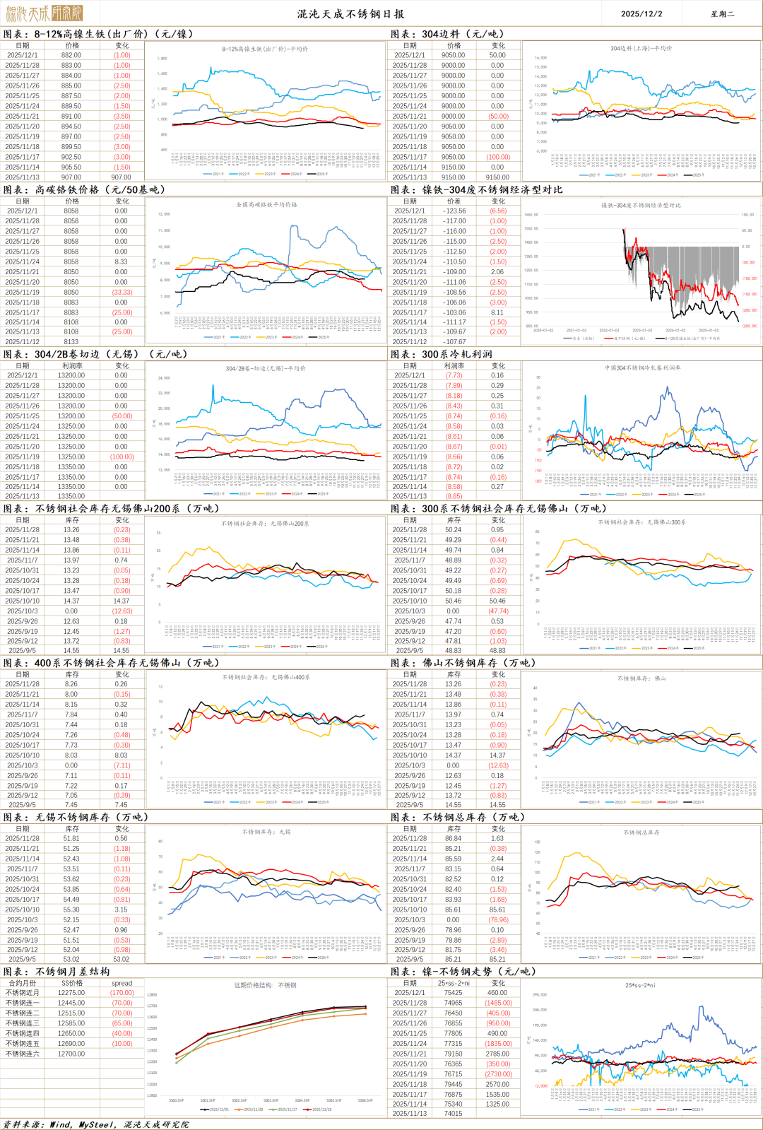 昨日不锈钢主力合约收盘价12415元/吨,涨跌幅+0.16%。无锡现货基差升水-40至545元/吨;主力合约持仓-8957至1208469手;仓单-121至62998吨。