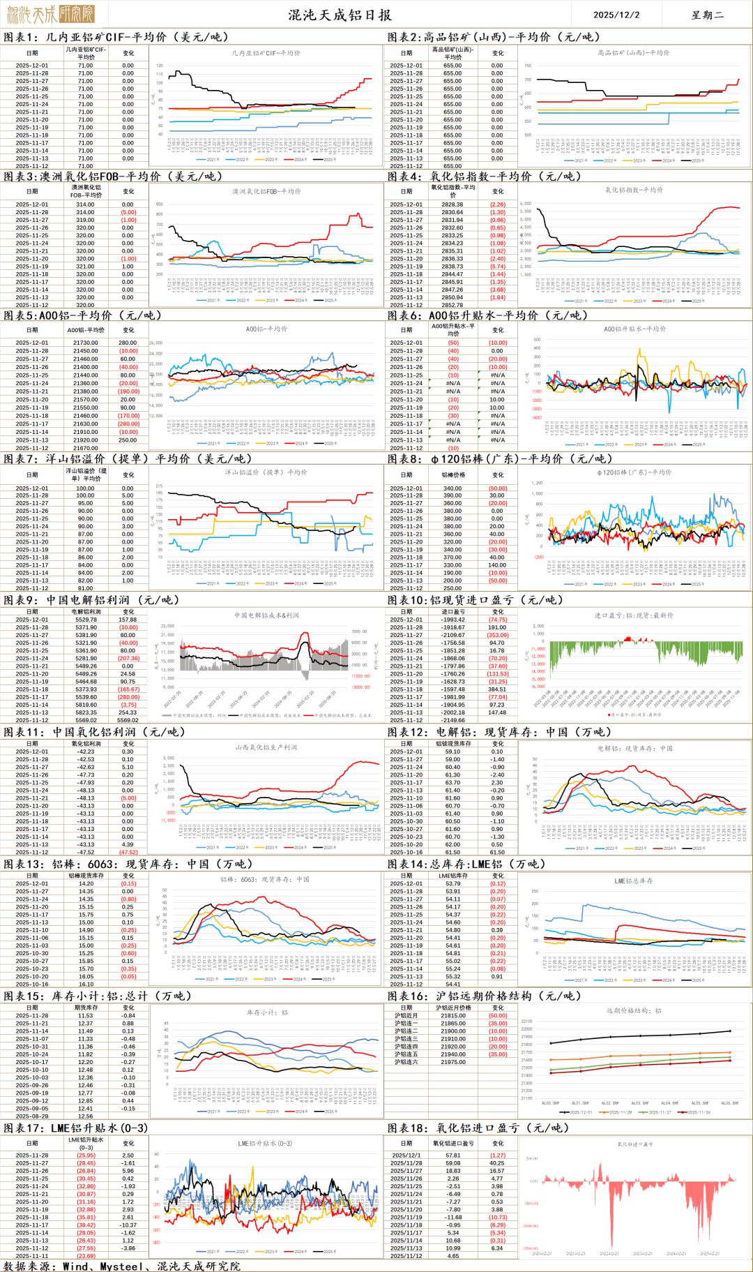 整体来看,美联储12月降息预期持续上行,日央行加息预期引发全球流动性收紧担忧,需持续关注美日利差。铝供应增量已步入低增速阶段,需求一旦启动,价格弹性是比较高的,世纪铝业因故障减产(-16万吨),Mozal因电力问题明年计划减产(-40万吨),印尼投产计划有所延后,明年供应增量有所下修,中长期仍低多思路为主。国内氧化铝期价破位下跌检验现金流成本支撑,或将倒逼减产,建议等待减产兑现给出空间后再进场做空。