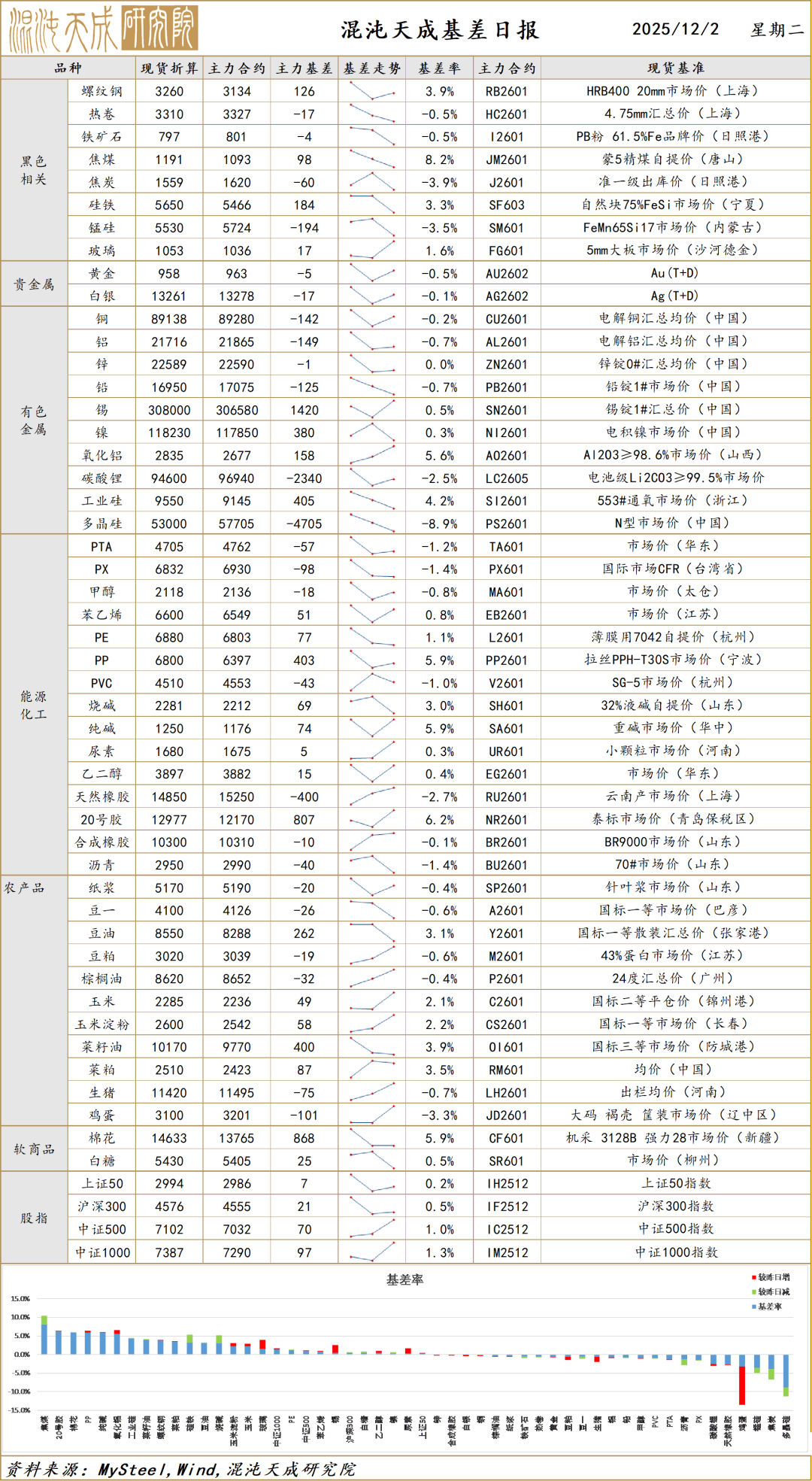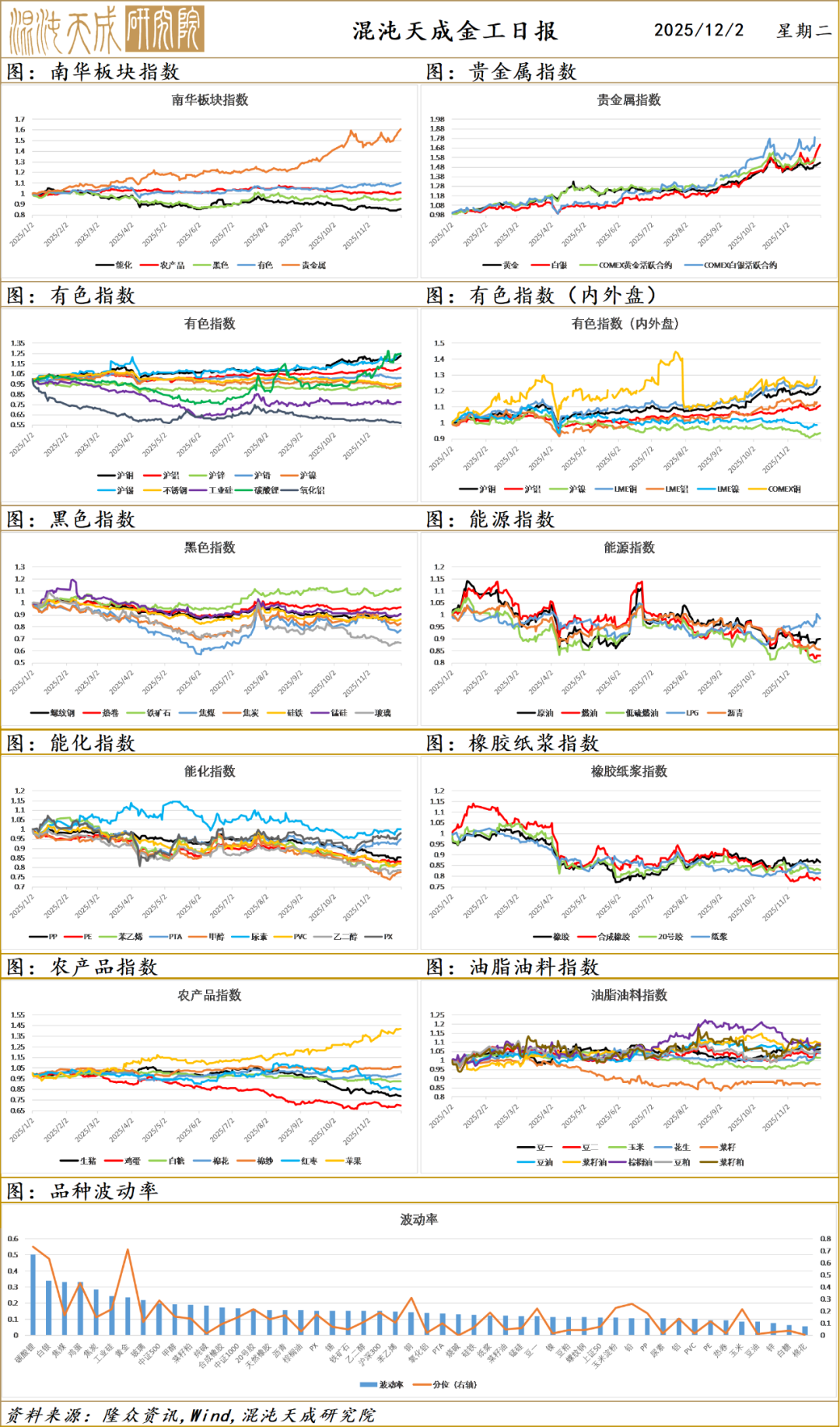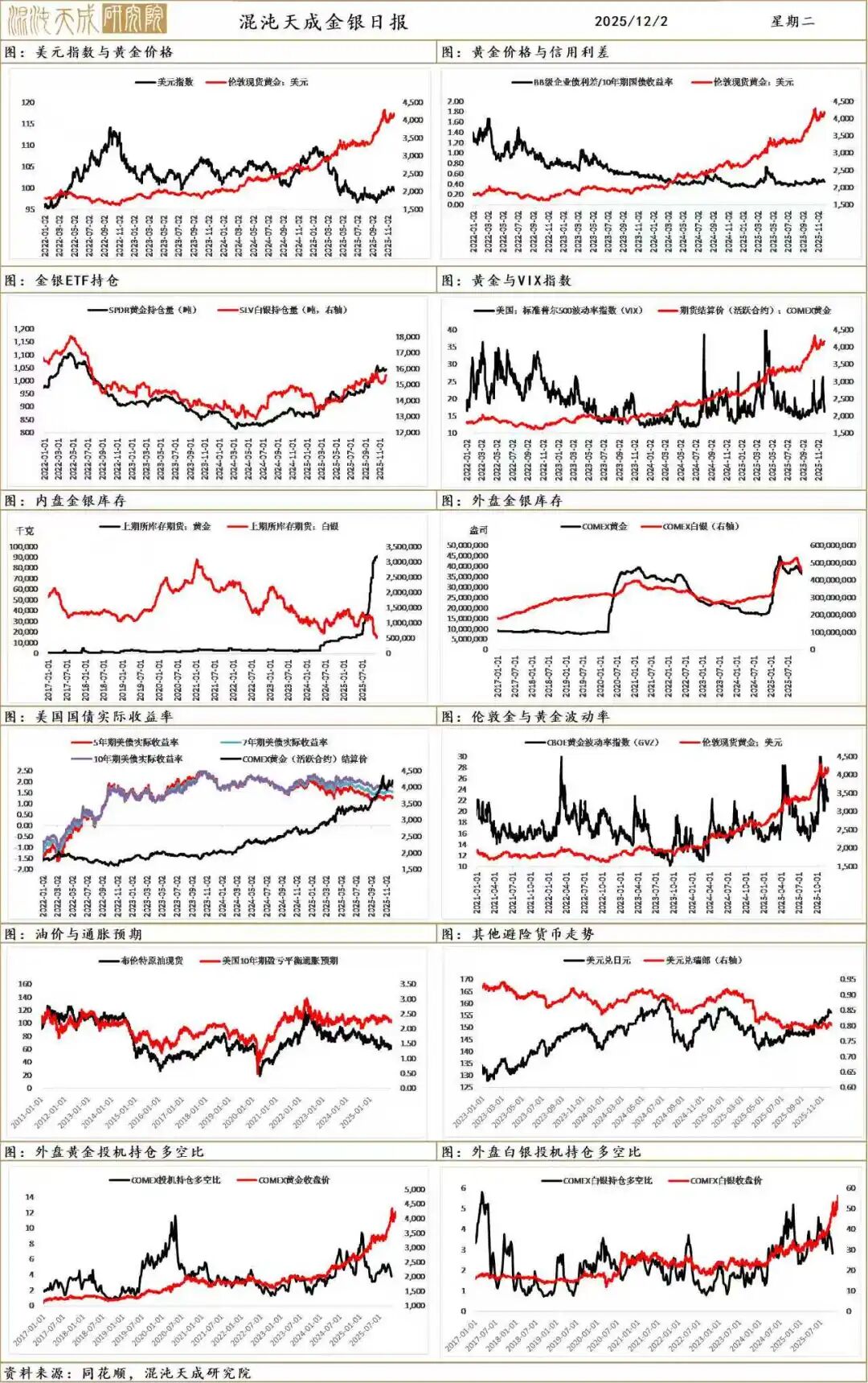 美国11月标普全球制造业PMI终值52.2;11月ISM制造业PMI为48.2,不及市场预期的49,连续第九个月处于收缩区间;分化仍来源于全球市场的不确定性。标普PMI虽强势,但此次增长主要动力来自工厂生产的强劲上升,新订单流入增速大幅放缓,暗示需求增长明显减弱,同步导致库存出现急剧上升。目前积压的未售出库存程度,已连续两个月达到自2007年有可比数据以来的最高水平。ISM PMI数据同步显示关税抬升部分商品价格,抑制了需求,未完成订单持续收缩。制造业指数仍处疲软,不足以改变市场降息预期,贵金属相对有支撑。