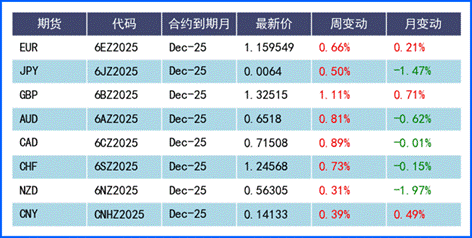 美元指数上周创7月以来最大跌幅。据市场消息,白宫国家经济委员会主任哈塞特已成为下届美联储主席核心候选者,并曾被认为与特朗普政府关系密切,双方均支持加快降息步伐。市场因此大幅上调鸽派预期,美联储12月会议下调25个基点基准利率概率已飙升至87%以上(一周前为39%)。整体来看,美元短期仍将继续受降息预期与政策不确定性压制,而地缘政治风险、央行政策动向、年底流动性紧张等因素则可能进一步推动美元单向波动。