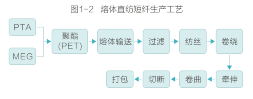 熔体直纺是以PTA和MEG为原料,生成聚酯熔体后, 不经生产聚酯切片的工序,直接纺丝、切断生成短纤。由于该工艺为一体化生产,单线产能较大,单位加工成本相对间歇纺略有减少,因此目前国内短纤常规品种的生产基本上采用熔体直纺技术。
