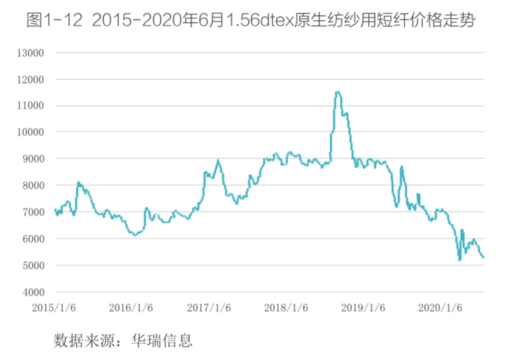 2015-2020年6月期间1.56dtex原生纺纱用短纤价格整体运行区间在5000~12000元/吨,总体呈现先逐步上升随后快速下跌的趋势。