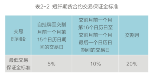 短纤期货合约的交易保证金标准按照其合约上市交易的时间分三阶段进行管理,与现有大部分品种保持一致,即自合约挂牌至交割月前一个月第15个日历日,最低交易保证金标准为5%;交割月前一个月第16个日历日至交割月前一个月最后一个日历日,最低交易保证金标准为10%;交割月期间,最低交易保证金标准为20%。