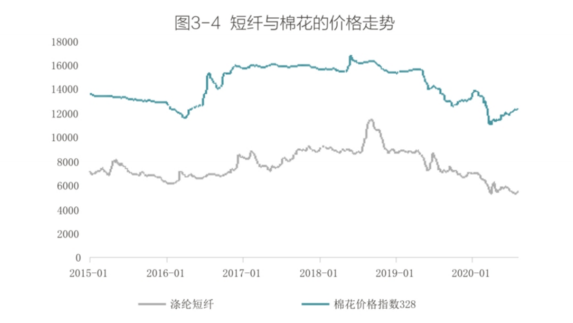再生短纤和原生短纤在部分领域可以互相替代,因此价格互相影响。2015- 2020年,两者的相关系数达到0.93。
