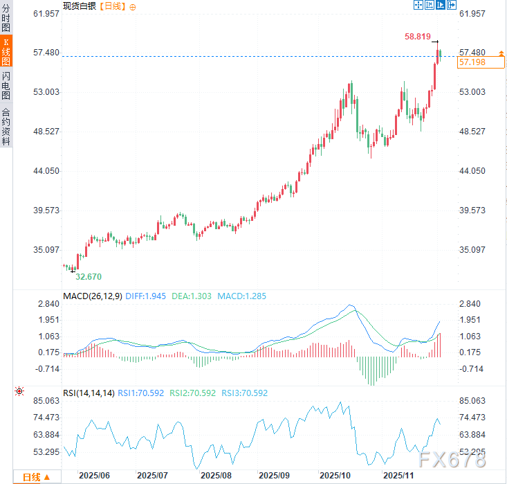 汇通财经APP讯——周二(12月2日)现货白银跌幅约1.30%,因前日强势上涨引发技术回调,但价格仍属于年度高位范围。此前一个交易日白银价格一度创下历史新高58.82美元/盎司,库存下降、投资者需求上升以及供应担忧再度升温,推动白银价格居于高位。
