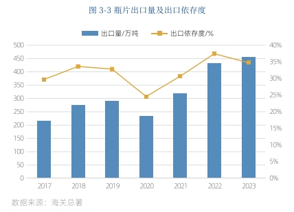 近年来,欧盟、美国、日本等国家和地区间断式启动对原产中国瓶片的反倾销、反补贴调查,并多次征收反倾销关税。作为应对,我国瓶片企业积极开拓南美、非洲、东南亚市场。