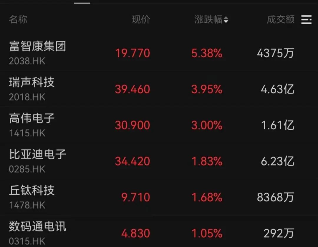 今日消费电子板块延续上涨,富智康集团、瑞声科技、高伟电子等分别收涨5.38%、3.95%、3.00%。