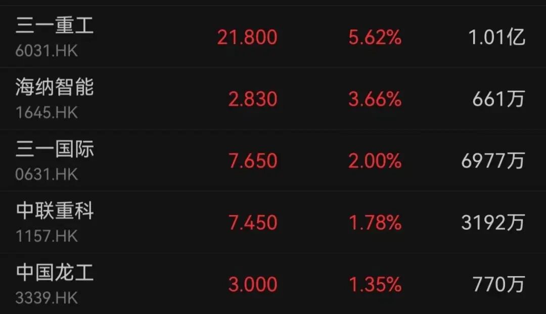 港股机械股出现异动,多只个股短线拉涨。截至收盘,三一重工涨超5%,三一国际、中联重科、中国龙工均收涨。