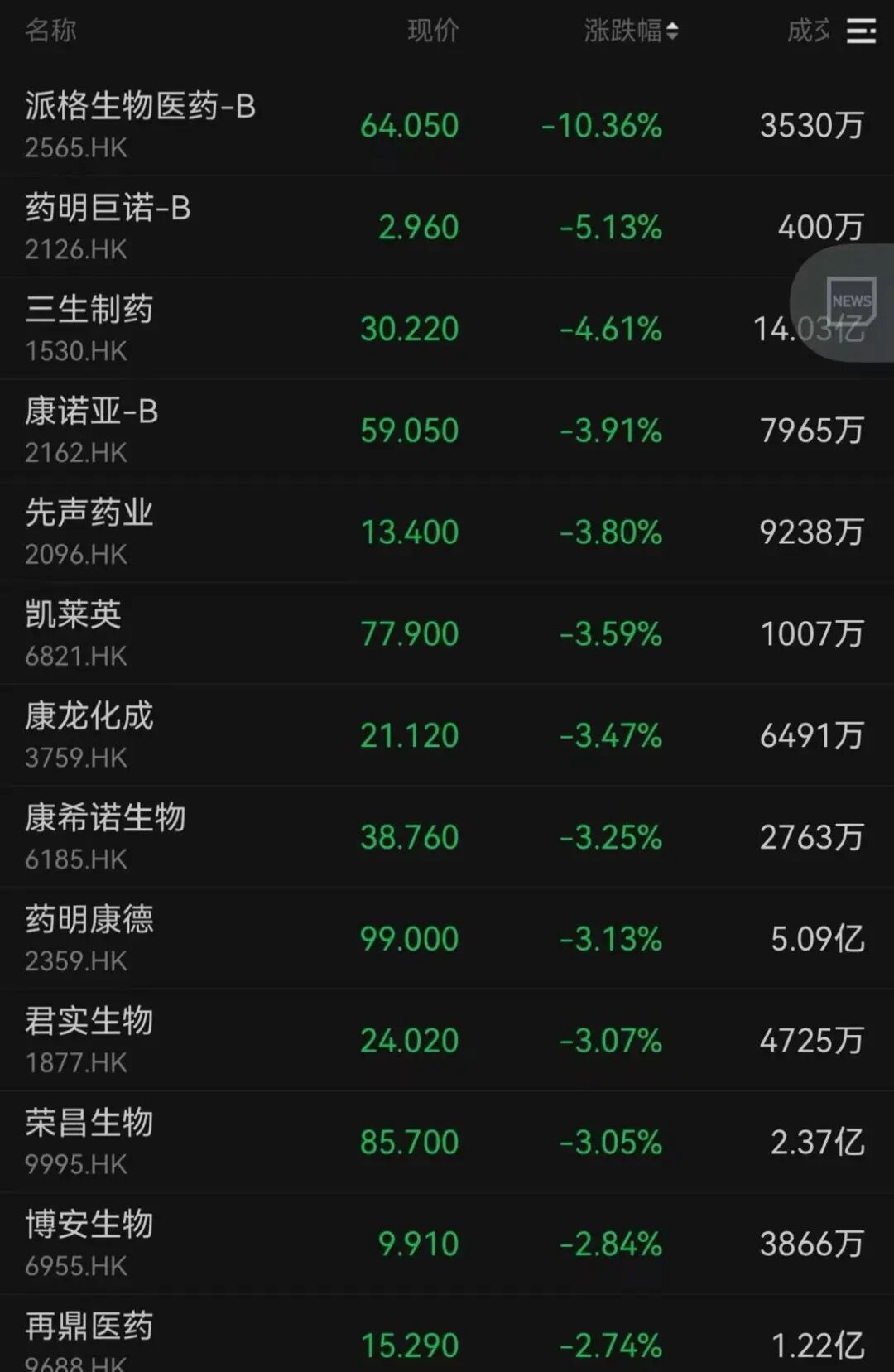 派格生物跌超10%