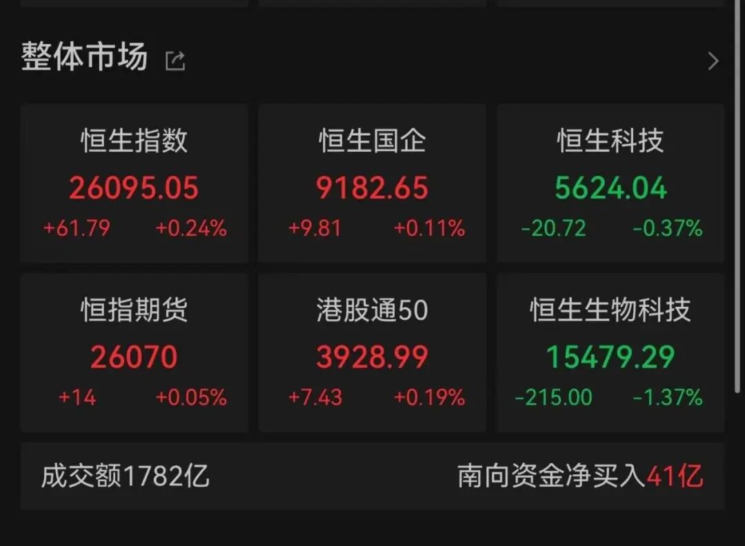 今日港股三大指数表现不一。恒生指数报收于26095点,大型科技股走势分化、部分车企跌幅靠前,拖累恒生科技指数最终收跌。
