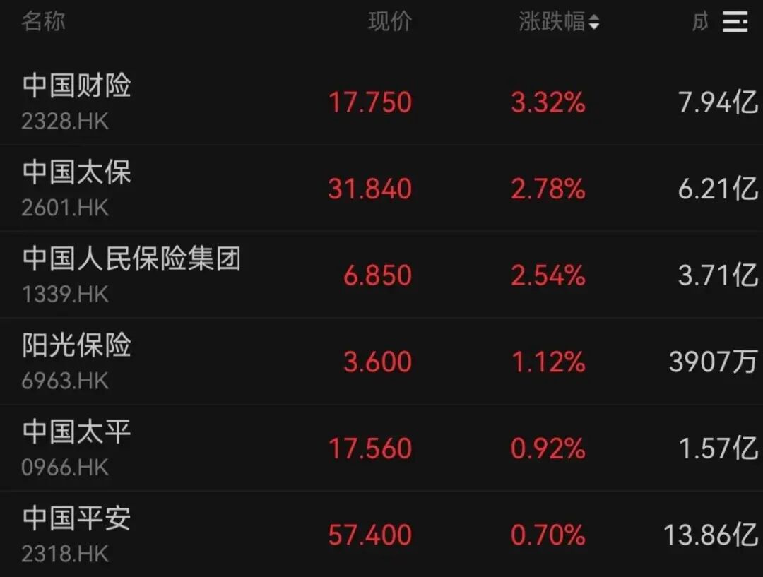 中国财险、中国太保、中国人民保险集团分别上涨3.32%、2.78%、2.54%。