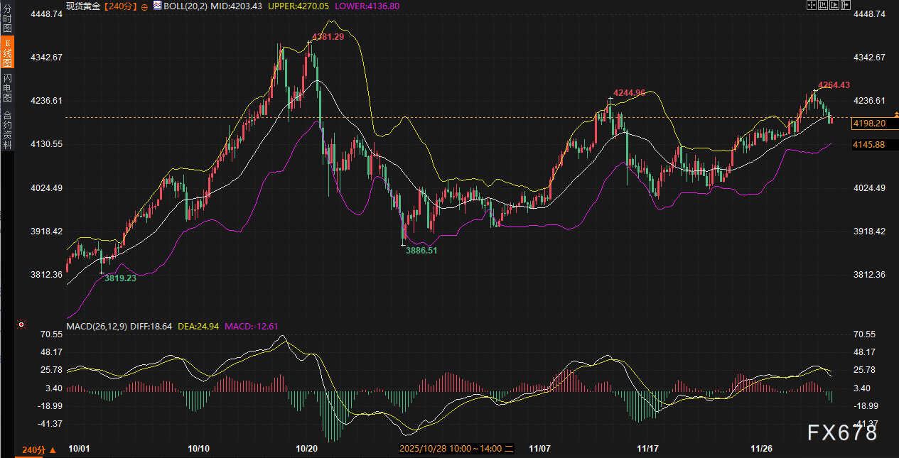 技术分析上,黄金240分钟图显示价格已跌破布林带中轨(4203.41),正向中轨与下轨(4136.79)之间运行,短期态势转弱。MACD指标呈现高位死叉后向下发散的状态,DIFF值(18.63)显著低于DEA值(24.94),且两者均处下行,表明短期调整动能正在释放。