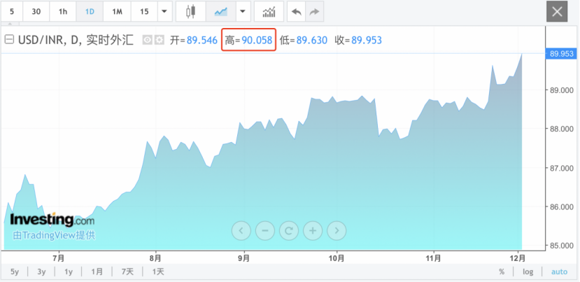 12月2日,印度卢比汇率持续走低,印度卢比兑美元汇率日内一度跌破重要心理关口90,最低跌至90.058,再度创出历史新低。