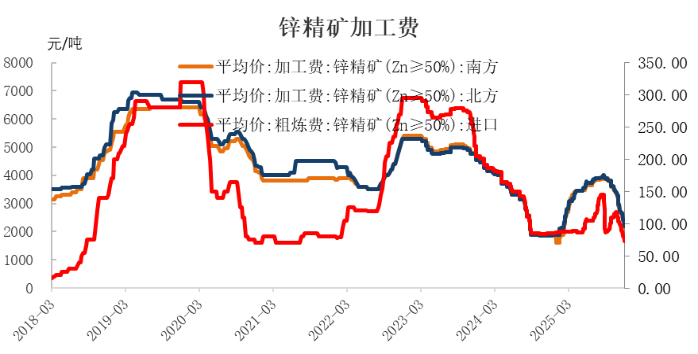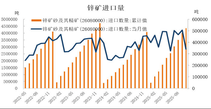 根据海关总署最新数据,2025年10月进口锌精矿34.09万吨,环比降低32.56%,同比增加2.97%。10月进口锌精矿量较9月超预期下滑。主要受周期性到货影响,澳大利亚锌精矿10月到货量出现显著减少,贡献主要减量;内外比价继续走差,进入9月中国进口锌精矿亏损扩大。