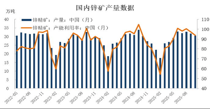 根据SMM数据,2025年11月SMM中国精炼锌产量59.2万吨,环比下降2万吨以上,同比增加16%左右,1-11月累计同比增加10%,低于预期值。预计2025年12月国内精炼锌产量环比下降2万吨以上,同比增加10%,预计2025年1-12月累计同比增加将近11%。