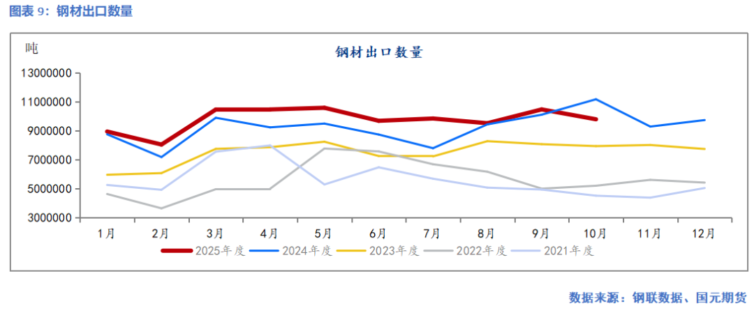 10月,中国钢材出口量为978万吨,环比减少6.6%,同比减少12.3%;1-10月累计出口钢材9774万吨,同比增长6.6%。越南继续保持我国钢材第一大出口市场地位,当月进口量为102.7万吨,环比增长23.4%,增长主要来自热轧板卷抢出口的拉动。巴西与土耳其进口量亦显著上升,主要受板材类产品订单增加的推动。