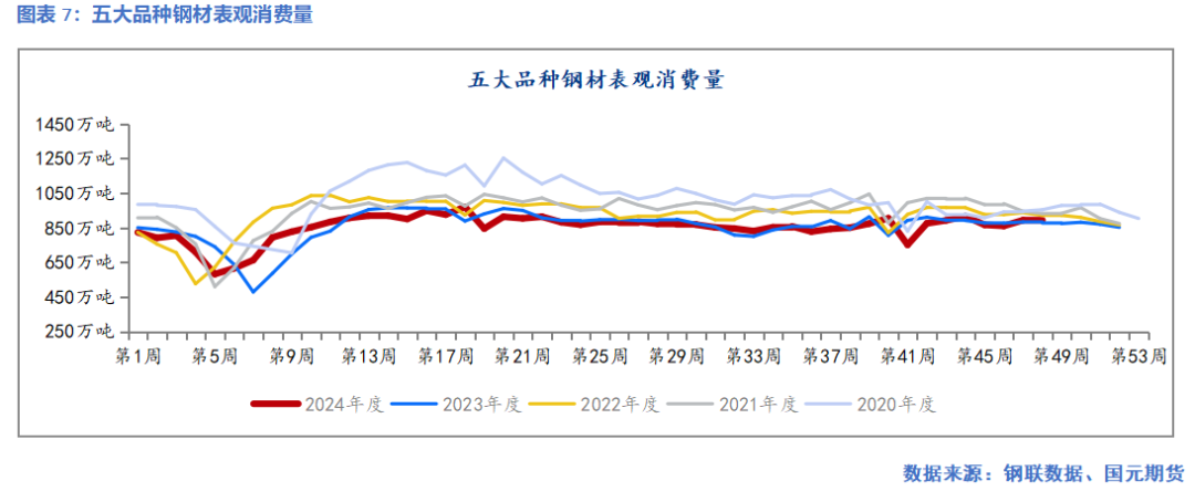 上周,五大品种钢材表观消费888.0万吨,周环比下降0.69%。其中,螺纹钢表观消费为227.94万吨,周环比下降3万吨,幅度为-1.30%。热轧卷板表观消费为320.22万吨,周环比下降4万吨,幅度为-1.23%。