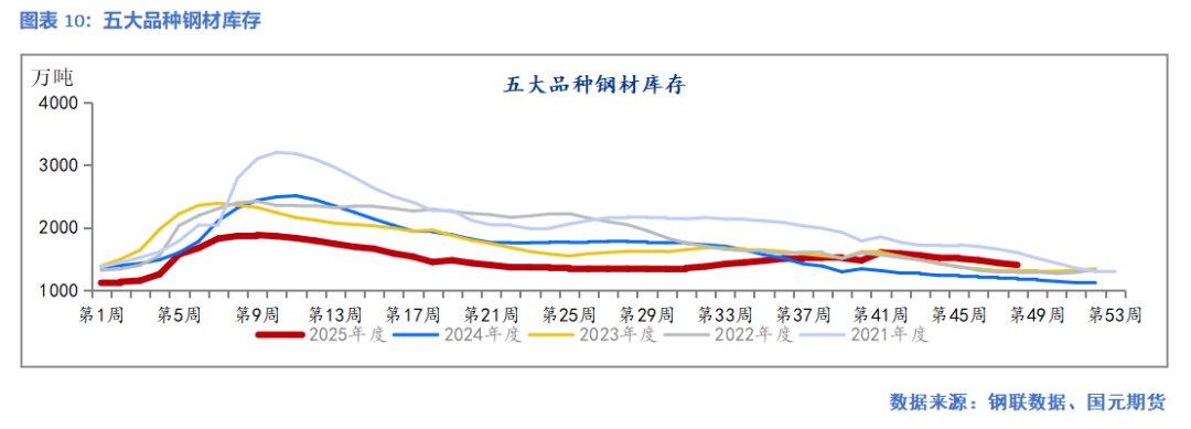 上周,五大品种钢材库存为1400.81万吨,周环比下降2.25%。螺纹钢库存为531.48万吨,周环比下降22万吨,幅度为-3.98%;其中,厂内库存为146.73万吨,周环比下降4.57%。社会库存为384.75万吨,周环比下降3.75%。热轧卷板库存为400.9万吨,周环比下降1万吨,幅度为-0.25%;其中,厂内库存为78.02万吨,周环比持平。社会库存为322.88万吨,周环比下降0.31%。
