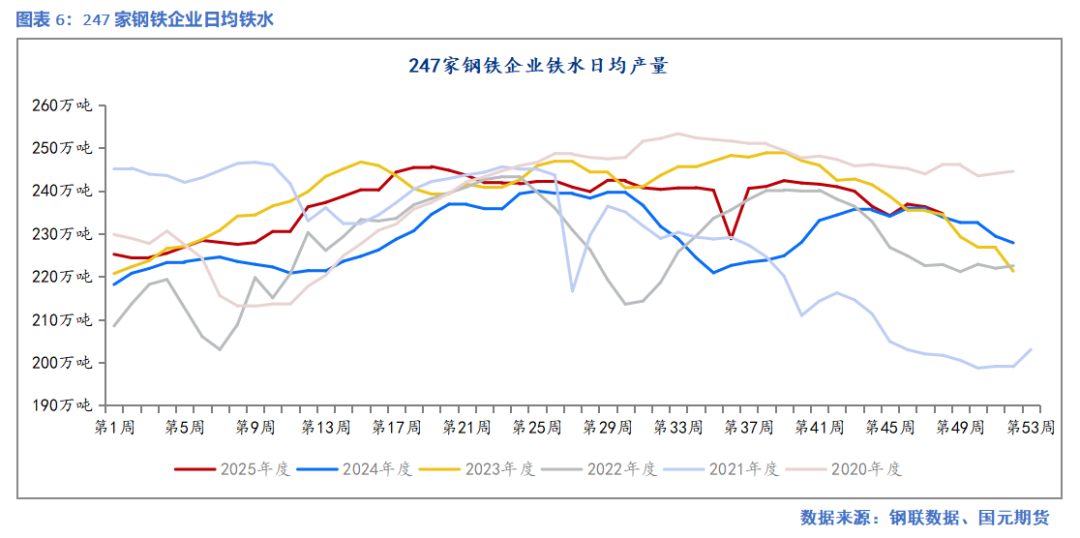 上周,247家样本钢厂盈利率35.06%,较上周下降2.6个百分点;247家样本钢厂高炉开工率为81.09%,较上周下降1个百分点;247家样本钢厂铁水日均产量234.68万吨/天,较上周下降0.68%;五大品种钢材当周产量855.71万吨,周环比增加0.68%