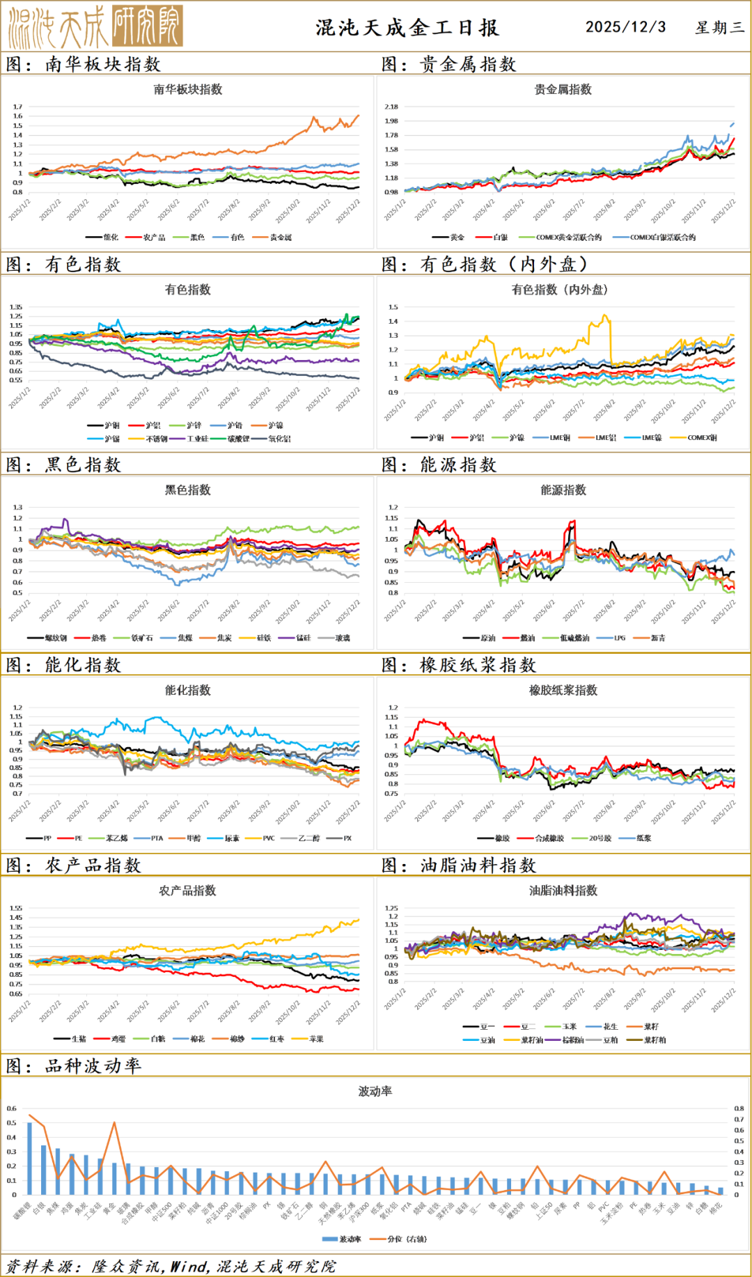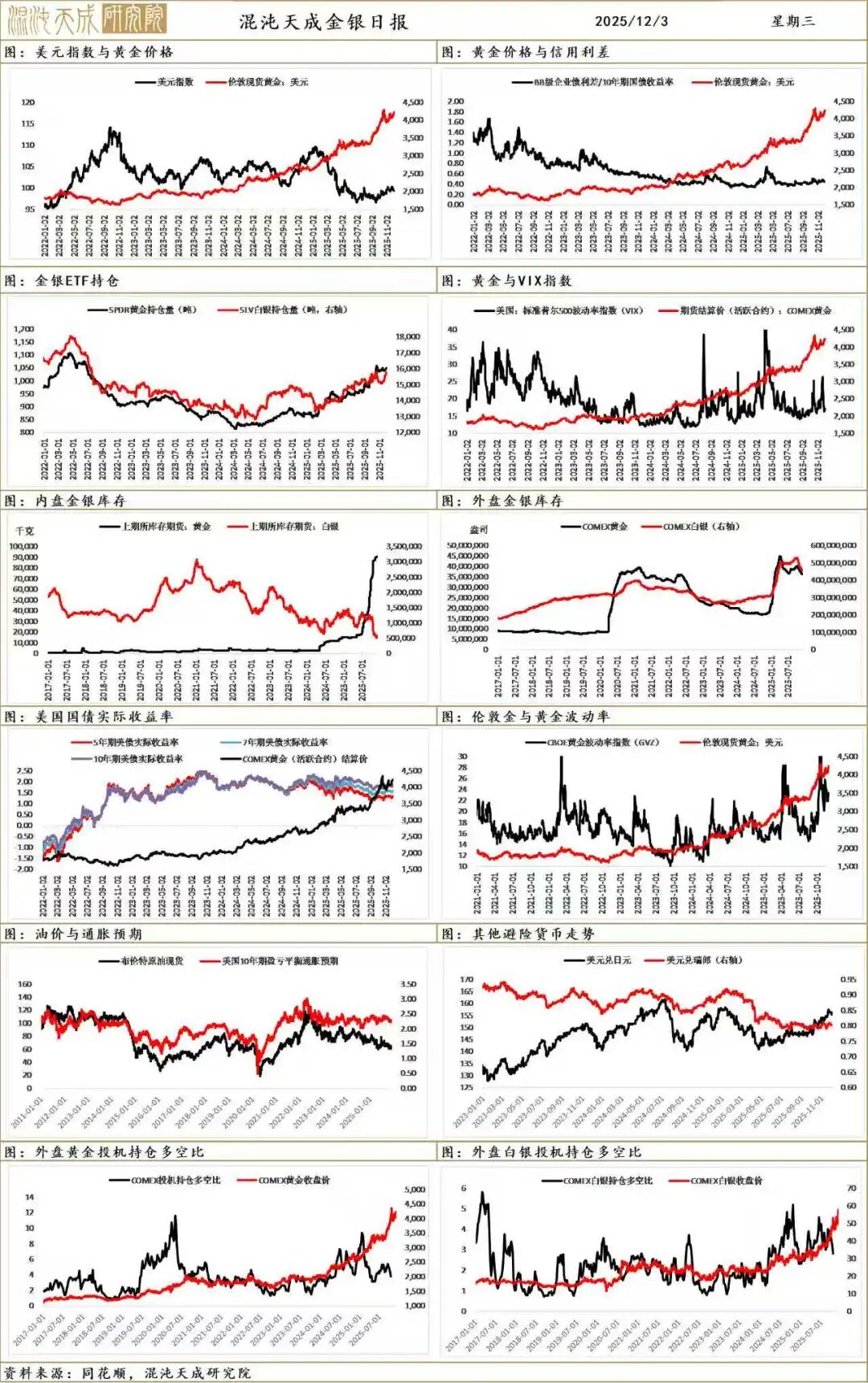 美国11月标普全球制造业PMI终值 52.2;11月ISM制造业PMI为48.2,不及市场预期的49,连续第九个月处于收缩区间;分化仍来源于全球市场的不确定性。标普PMI虽强势,但此次增长主要动力来自工厂生产的强劲上升,新订单流入增速大幅放缓,暗示需求增长明显减弱,同步导致库存出现急剧上升。目前积压的未售出库存程度,已连续两个月达到自2007年有可比数据以来的最高水平。ISM PMI数据同步显示关税抬升部分商品价格,抑制了需求,未完成订单持续收缩。制造业指数仍处疲软,不足以改变市场降息预期,贵金属相对有支撑。