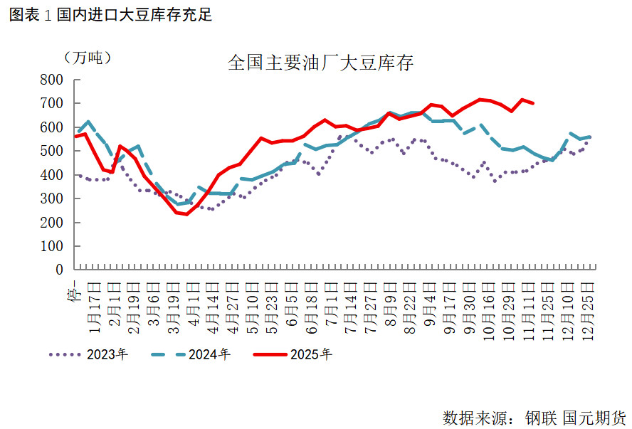 库存来看,根据钢联统计,2025 年第 45 周,全国油厂大豆库存再次增加至 761.95 万吨,环比增幅 7.20%,大豆到港量远超大豆压榨量水平,带动油厂大豆进一步累库。