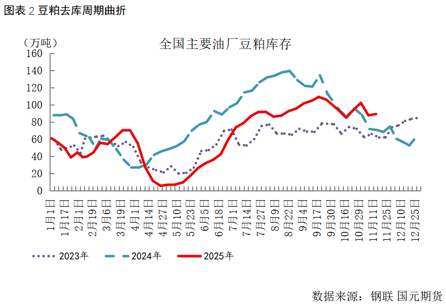 四季度国内进口大豆供应充足,后续到港仍维持高预期。豆粕供应来看,油厂延续高压榨高开机率,部分地区存在胀库停机现象,但需求端表现缺乏增量,下游饲料企业采购情绪一般,多以刚需采购、滚动补库为主,豆粕基差继续承压运行。供强需弱格局之下,国内重点地区油厂豆粕库存仍维持高位,去库进程表现较往年曲折。根据钢联数据统计,截至11月13日,全国油厂豆粕库存继续降低至99.86万吨,较上周减少15.44万吨,减幅13.39%,同比去年增加19.11万吨,增幅23.67%。