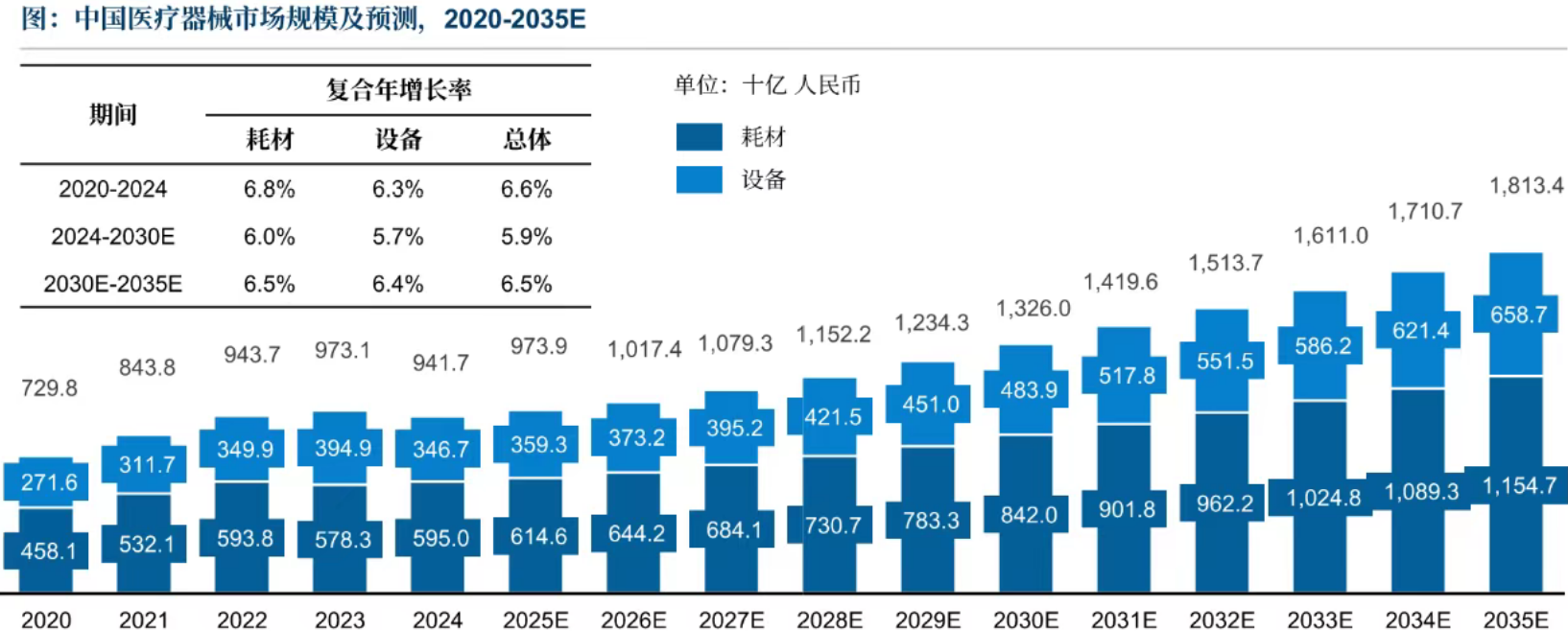 整行业来看,根据弗若斯特沙利文数据分析,2020-2024年,中国医疗器械总体市场规模已从7,298亿元人民币增至9,417亿元人民币,CAGR为6.6%;预计到2035年,中国医疗器械总体市场规模将达到18,134亿元人民币。