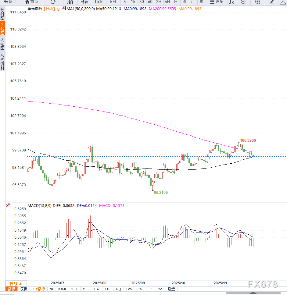 从DXY日线图观察,美元指数近期在接近100关口后承压回落,短期均线排列偏弱。K线显示高位震荡下行趋势,MACD动能柱继续在零轴附近走弱,RSI从中性区逐步回落至约48,表明上行动能不足。