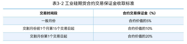 工业硅期货合约的最低交易保证金为合约价值的5%。自进入交割月份前1个月第15个交易日起,交易所将分时间段逐步提高合约的交易保证金标准。