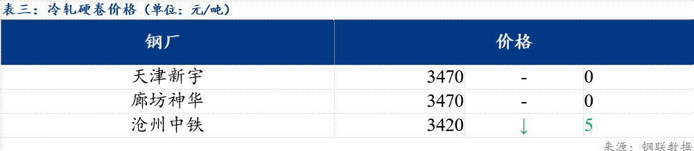 今日北方市场冷轧基料3.0*1010*CSPHC河北普阳价格为3240元/吨,较上一期价格持稳,河北纵横价格为3250元/吨,较上一期价格持稳。镀锌方面,今日北方钢厂指导价格持稳运行;轧硬方面,当前主流报价3420-3470元/吨。市场方面,现货市场价格维持弱稳运行,交投氛围较为清冷,大户日度成交100吨,较昨日有所减少,部分钢厂将资源向南方投放,增加接单量。