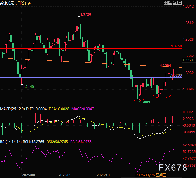 经济学家预计,美国私营部门11月新增就业人数仅为5000人,较10月的4.2万人大幅下滑;ISM非制造业PMI则预计从10月的52.4小幅回落至52.1。多位FOMC成员近期已对就业需求疲软表达担忧,并倾向于扩大宽松力度,若数据不及预期,将进一步强化美联储降息预期,大概率推动英镑兑美元继续上行。