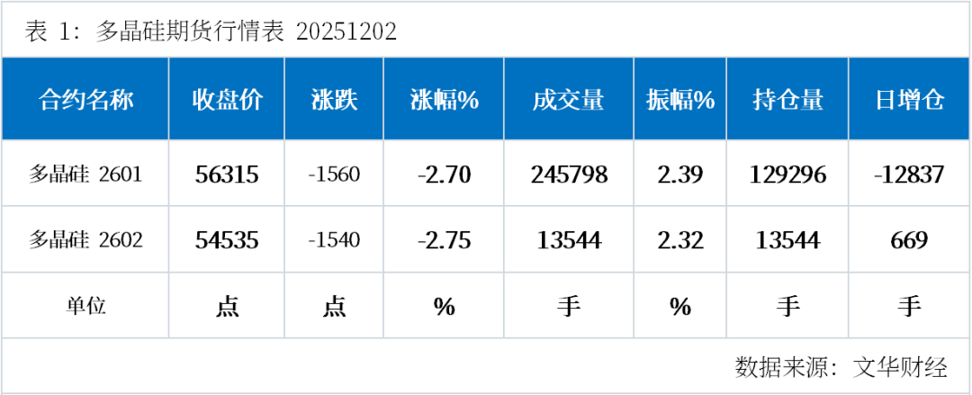 昨日(20251202)多晶硅主力合约PS2601收盘报56315元/吨。成交量245798手;持仓量129296手。