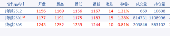 当日(20251202)纯碱期货震荡上涨。其中纯碱2601(SA601)开盘价1177元/吨,最高价1191元/吨,最低价1175元/吨,收盘价 1183元/吨,较上一个交易日结算价上涨15元/吨,涨幅1.28%,成交量81.47万手,较上日减少17.6万手,持仓量110.89万手,较上日减少4.78万手。