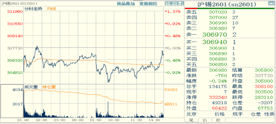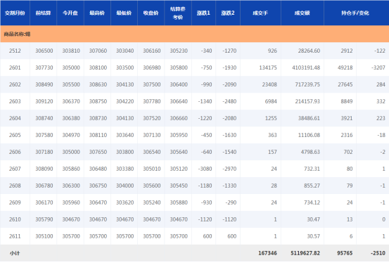 昨日沪锡2601合约呈现震荡调整态势。开盘价305000元/吨,收盘价306980元/吨,当日最高价308100元/吨,最低价303500元/吨成交量134175手。