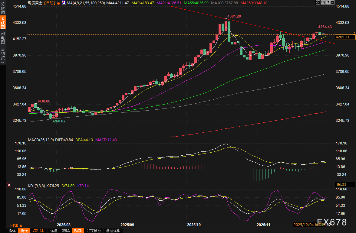 汇通财经APP讯——周四(12月4日)亚市早盘,现货黄金窄幅震荡,目前交投于4205美元/盎司附近。周三国际金市呈现出持稳态势,现货黄金价格大多数时间稳定在每盎司4200上方,疲软的美国就业数据一度帮助金价盘中触及4241.40美元的高点,但尾盘回吐涨幅,收报4203美元附近,接近收平。与此同时,白银价格周三刷新历史高点,盘中一度达到58.95美元,仍为黄金提供了支撑,也反映出市场对美联储降息的强烈预期,推动美国债市收益率回落、美元走软以及股市上涨。随着美国劳动力市场意外下滑和美联储宽松政策信号日益明显,白银的强势飙升已点燃贵金属板块热情,而黄金作为传统避险资产,似乎正蓄势待发。