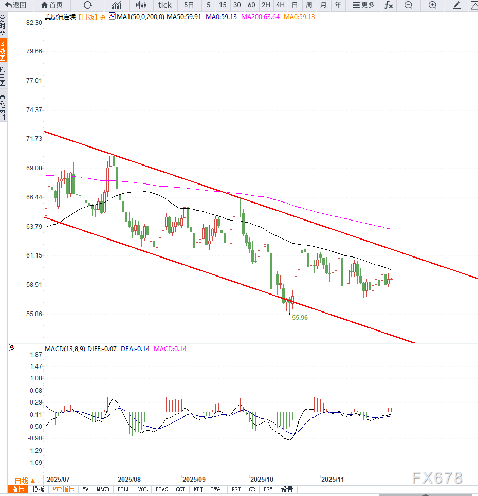 从日线级别走势来看,WTI价格持续在58—60美元/桶区间震荡整理,显示多空力量短期内难分胜负。58美元下方多次形成支撑,表明买盘意愿仍在;60美元上方压力明显,构成阶段性强阻力。