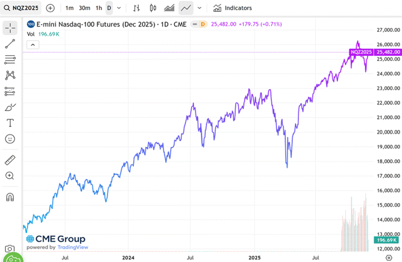 从大方向来看,2026年难以简单归类为“泡沫尾声”或“熊市元年”;但从市场节奏来看,则几乎可以肯定不会平稳。AI估值、选举政治与宏观基本面的交织,极可能形成一种“曲折上行,高波动性”的市场结构。基于此,,芝商所CME的纳斯达克股指期货(产品代码:NQ)将成为风险管理与机会捕捉的关键工具。它既能用于对冲市场在短期内超买后回撤的风险(参照图5的中期选举年美股收益历史规律),也能在选情意外引发市场大幅波动时,提供必要的避险手段和快速反应的灵活性。