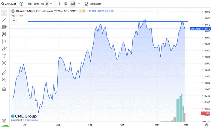 比如现在美国10年期国债又再次测试了前高。26年3月份到期的国债期货价格现在交易在113,对应于利率则在4%的关键点位。如果明年年初出现幺蛾子,那么我认为美国10年债期货价格应该会重新向下。