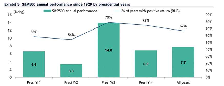 然而,历史上的中期选举年份,无论美国的执政党怎么努力,似乎美股的平均收益都只有个位数。自1929年以来,总统任期第二年(中期选举年)是标普平均表现最差的一年,平均涨幅约3%,正收益概率也明显低于其他三年。