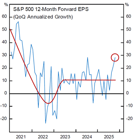 美国经济处在一种典型的“弱平衡”状态:不是高歌猛进,但也远没有到衰退门口。盈利端的数据相当亮眼——三季度超过八成标普成分股业绩超预期,混合口径EPS同比增速在13%左右,未来12个月的盈利指引预期接近30%,与以往几轮熊市起点“盈利已见顶、预期全面下修”的情形完全不同。