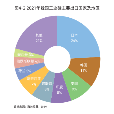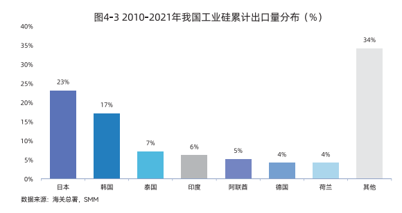 2021年我国工业硅出口排名前三的国家分别是日本、韩国、泰国,按照2010 -2021年累计出口量计算的排名与此一致。
