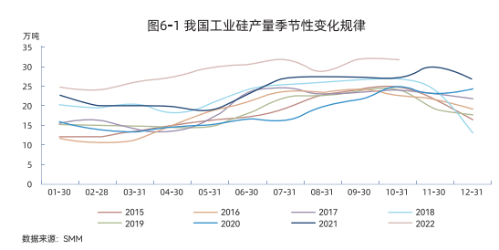 增加;每年12月 至次年5月为枯水期,电力资源不足,工业硅生产成本抬升、供应减少。新疆地区工业硅生产因使用火电而相对平稳,开工主要受到原料供给的影响。