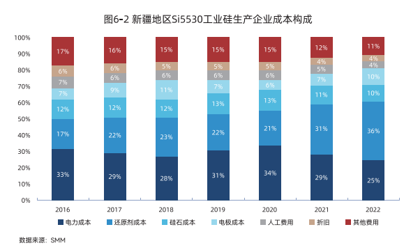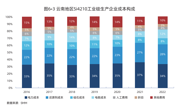工业硅生产过程中的成本结构包含电力成本、还原剂成本、硅石成本、电极成本、人工成本、折旧成本以及其他费用。不同生产企业的成本由于各自电价、原料以及技术工艺的差异而各不相同。