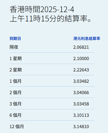 12月4日,港元拆息普遍向上,与楼按相关的一个月拆息报3.03482%,升15.024基点,连升两日,是11月28日后最高;反映银行资金成本的三个月拆息报3.03458%,升2.631基点。