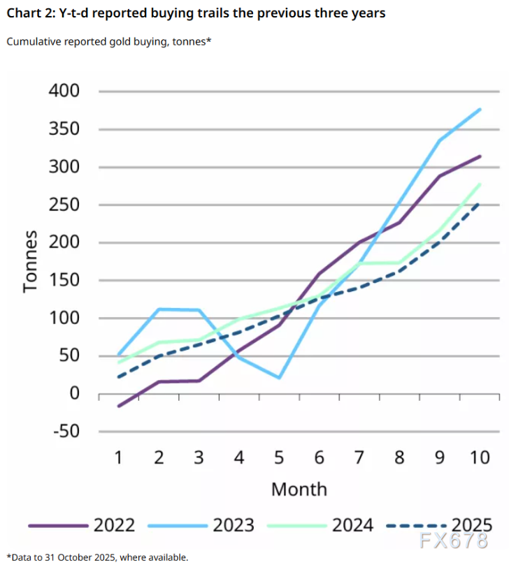 他指出,2025年截至10月的已公布净购买量总计254吨,这一节奏较过去三年有所放缓。