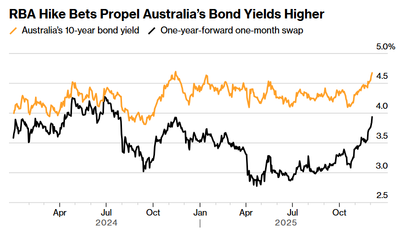 周四公布的一项统计数据显示,10月澳大利亚家庭支出增速快于经济学家预期,此前一天公布的经济数据显示衡量薪资增长的指标意外扩张,暗示通胀压力不断上升。这些数据可谓强化了明年澳联储重启加息的理由。隔夜指数掉期显示,澳大利亚联储将在2026年底前将其官方现金利率上调25个基点。而就在一个月前,这些合约还显示出超过50%的年内进一步降息概率。