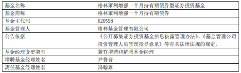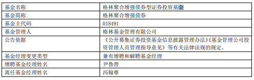 中国经济网北京12月4日讯今日,格林基金公告,冯翰尊离任格林聚利增强一个月持有期债券、格林聚合增强债券、格林泓远纯债、格林聚享增强债券、格林泓盛一年定开债券发起式。