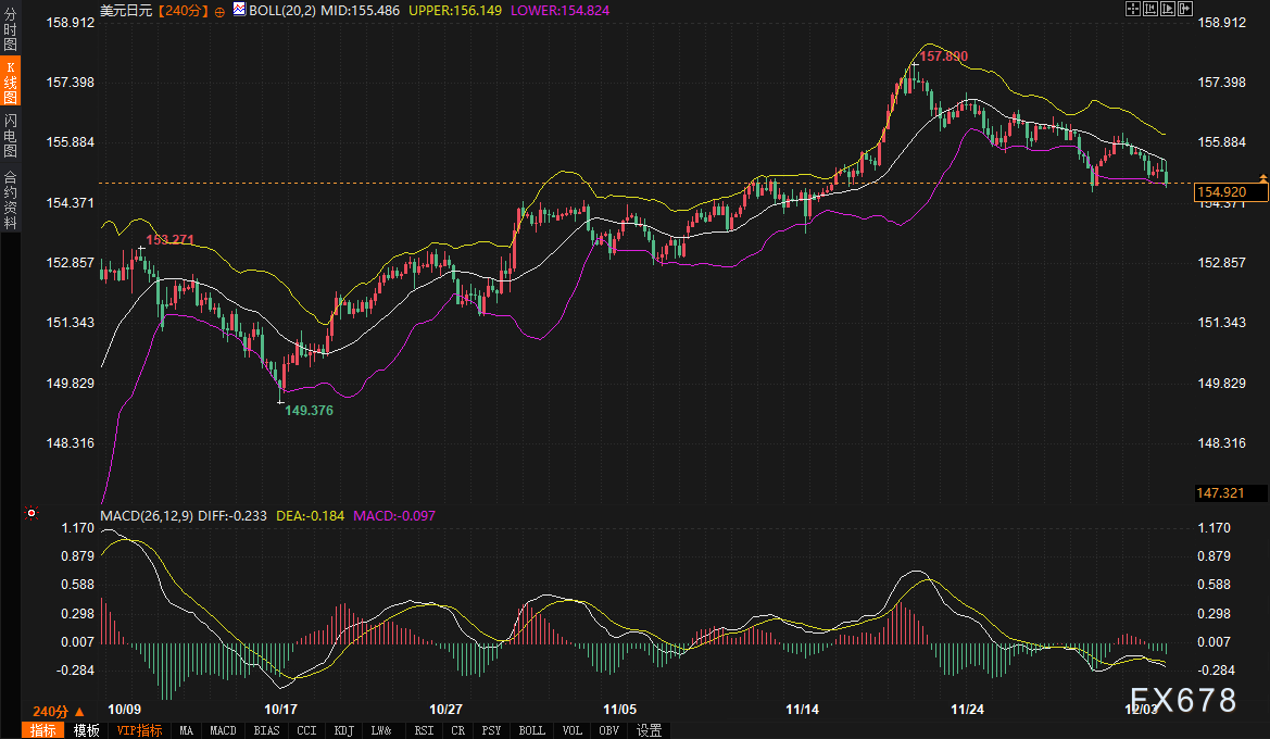 美元兑日元的技术图表清晰地反映了当前市场的犹豫不决。240分钟图上,价格目前运行于布林带中轨(155.485)下方,且布林带下轨(154.818)近在咫尺,显示短期动能偏空。MACD指标中,DIFF与DEA线均位于零轴下方,且DIFF低于DEA,进一步确认了短期的下行压力。