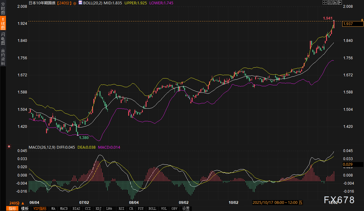 汇通财经APP讯——周四(12月4日)亚洲及欧洲交易时段,日本金融市场成为全球焦点。美元兑日元汇率在155关口附近震荡承压,240分钟图显示价格运行于关键均线下方,当前报于154.889附近。与此同时,日本国债市场经历了一场剧烈的多空博弈,十年期国债收益率一度飙升至1.935%,创下2007年7月以来的新高,最终收于1.935%,全日上行4.5个基点。市场异动的核心驱动力,源于一则关于日本央行与政府关系的深度报道,该报道几乎确定了十二月加息的议程,并将政策制定者面临的长期沟通困境置于台前。
